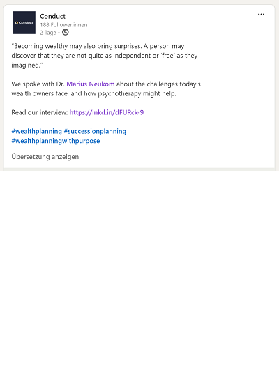 Marius Neukom im Interview mit Conduct (2024): Opening the horizon: how psychotherapy can encourage a deeper understanding of the complexities of wealth.